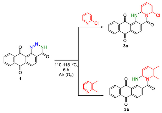 It was found that pyridines with a chlorine atom or a methyl group in the second position of the ring (2-chloropyridine, 2,3-dimethylpyridine) reacted with anthra[1,2-d][1,2,3]triazine-4,7,12(3H)-trione 1, forming the corresponding dihydrogenated cyclic compounds 3a,b (Scheme 3) as the final products. In the case of 2,6-dimethylpyridine, no reaction occurred.
