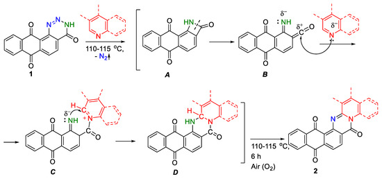 Taking into consideration the data on the mechanism of thermolysis of 1,2,3-benzotriazin-4(3H)-one [17,23,24], the probable mechanism of thermolysis of anthra[1,2-d][1,2,3]triazine-4,7,12(3H)-trione 1 in the presence of pyridines is realized through an azetidinone intermediate with the formation of iminoketene via intermediates A–D (Scheme 4). In the first stage, the elimination of nitrogen molecules occurs with the formation of azetidinone A, via the ring-opening rearrangements into iminoketene B. The carbonyl group of the intermediate B undergoes a nucleophilic attack by the nitrogen atom of pyridine with the formation of pyridine salt C. Next, the nucleophilic iminoketene nitrogen attacks the carbon atom in the α-position of the pyridine ring with future ring closure. This conducts to a dihydrogenated intermediate product D, whose following oxidation by air leads to the formation of the target pentacyclic anthrapyridinopyrimidinone product 2. Furthermore, the isolation of intermediate type D compounds 3 in the individual state is a weighty confirmation of the passing of the reaction.