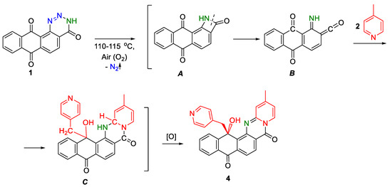 Hence, we tried to determine the moment of the addition, which could be before the start of thermolysis, during its course, or after the formation of the annelated product 2d. For this purpose, two independent experiments were conducted: heating of anthratriazinone 1 with 4-methylpyridine at 70 °C for 6 h, and heating of anthrapyridinopyrimidinone 2d with 4-methylpyridine at 115 °C for 6 h. In both cases, product 4 was not detected by TLC or LC-MS. The latter indicates its formation in the process of thermolysis. Taking into consideration these results and the above Scheme 3, we proposed a mechanism for the formation of by-product 4 in the reaction of anthra[1,2-d][1,2,3]triazine-4,7,12(3H)-trione 1 with 4-methylpyridine through intermediates A–C (Scheme 6).