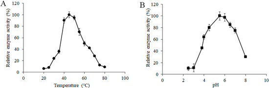To determine the optimal pH, enzymatic activity was measured under different pH values ranging from 2.6 to 8.0 (2.6, 3.0, 3.6, 4.0, 4.4, 5.2, 5.6, 6.0, 6.6, 7.2, and 8.0) at 45 °C for 1 h using p-NPG as the substrate.