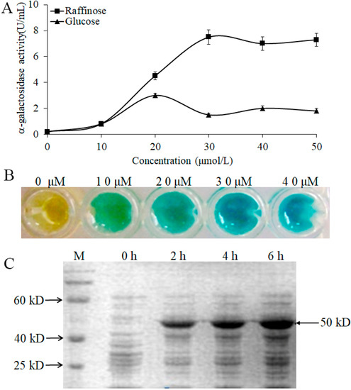 To further confirm the induced effect of α-galactosidase by raffinose, we measured the enzymatic activity with different concentrations of raffinose and glucose. The data indicated that the expression of α-galactosidase could be induced by raffinose and glucose (Figure 5A). However, there was a stronger induced effect for raffinose than for glucose, and the maximum induced effect for raffinose occurred at a concentration of 30 μmol/L (Figure 5A,B). We also analyzed the α-galactosidase expression induced by raffinose (30 μmol/L) at different times, and the results showed that the molecular size of the α-galactosidase in WHPC005 was approximately 50 kD. The α-galactosidase was strongly induced by raffinose after 2 h of treatment, and a large accumulation resulted after 6 h of treatment (Figure 5C).