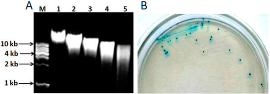 The genomic DNA extracted from L. pasteurii WHPC005 was digested with different concentrations of Sau3A I (0.2, 0.4, 0.6, and 0.8 U/µL) to optimize the random digestion. As shown in Figure 6A, the optimal reaction conditions were 1 μg of genomic DNA digested with 0.8 U of Sau3A I for 120 min to obtain random genomic fragments 3–5 kb in length. These random fragments were ligated into the pUC19 plasmid through the BamH I site, and then transferred into competent DH5α cells. The positive clones were identified with X-α-gal (20 µg/mL) (Figure 6B).
