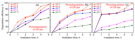The pH of the solution affects the adsorption and degradation dynamics since it modifies the ionization states of the binding groups of the dye and the photocatalyst [47]. The effect of pH of the dye solution on the rate of photodegradation of CR dye using M−rGO, AgxO, and M−rGO−AgxO nanocomposite photocatalysts are shown in Figure 5. The maximum equilibrium degradation capacity is obtained at pH 3 for all three sample types. At pH 3, degradation efficiency for M−rGO is 94.7%, for AgxO is 95.0% and for M−rGO−AgxO is 98.4%. From Figure 5 it is seen that the removal efficiency is at its lowest value at pH 11 for all the sample types. At pH 11, the degradation efficiency for M−rGO is 26.4%, AgxO is 27.0% and for M−rGO−AgxO is 51.3%. At lower solution pH, CR solution produces protonation of nitrogen atoms at amide and amines groups.