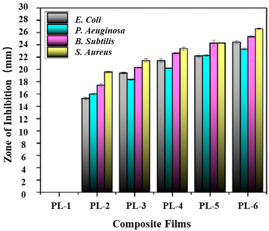 Subbuvel et al. [61] used neem oil (NO), curcumin (Cur), and polylactic acid (PLA) and the above method to prepare PLA/NO composite films with a mass fraction of 5 wt% and 10 wt% and PLA/NO/Cur composite films with an NO ratio of 10 wt% and Cur percentage of 1 wt%, 2 wt%, and 3 wt%, respectively (Table 5). The Agar diffusion method was used to detect the inhibitory effect of the sample on four kinds of bacteria: Escherichia coli, Staphylococcus aureus, Pseudomonas aeruginosa, and Bacillus subskills. It can be seen in Figure 2 that pure PLA had no inhibitory effect on any bacteria, the film with NO had good antibacterial activity against these four kinds of bacteria, and the film with NO and curcumin had a significant antibacterial effect. The antibacterial activity of NO is related to compounds such as nimbidin, nimbolin, and mahmoodi [62].