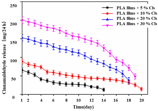 To achieve the long-lasting antibacterial effect of the film, Zhang et al. [66] wrapped cinnamaldehyde (CA) with cationic-cyclodextrin using the package method and the complex was called Cls. Composite films with 0%, 5%, 10%, 20%, and 30% Cls mass fractions were produced using automatic coating equipment, in which the plasticizer tributyl citrate (ATBC) was added. The antibacterial activities of several composite films against the foodborne pathogens Escherichia coli and Listeria monocytogenes were measured (Table 8). The results showed that the inhibition rate of the 5% composite film on Listeria monocytogenes was as high as 60.6%, which was much higher than on Escherichia coli [65,67]. The other contents of the composite film showed a 100% inhibition rate on both foodborne pathogens. Some studies have shown that the antibacterial mechanism of cinnamaldehyde is that it can destroy the cell membrane of bacteria, make some substances in bacteria flow out of cells, and eventually lead to cell death [68]. In addition, the antibacterial effect of the antibacterial film is also related to the release of cinnamaldehyde in vitro, as shown in Figure 3. It can be seen in the picture that when the content of cinnamaldehyde was low (5%, 10%), the release of CA was smooth and slow and the effect was better. However, compared with the composite film containing 5% Cls, the release period of the composite film containing 10% Cls was 20 days, which was prolonged by 6 days. In a word, the composite film with 10% Cls not only produced a good antibacterial effect but also improved the morphology, crystallinity, oxygen resistance, water resistance, and tensile strength of the corresponding antibacterial PLA film. Therefore, it is suitable for fruit packaging materials.
