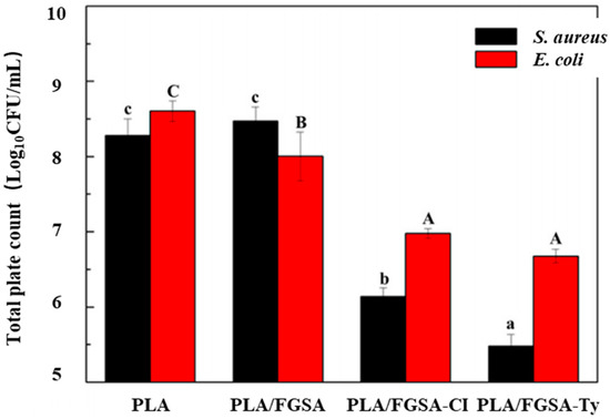 Roy et al. [55] prepared PLA-based composite films with different mass fractions of curcumin by solvent casting. The effects of the curcumin concentration on the compatibility, antibacterial properties, UV resistance, hydrophobicity, water-vapor permeability, mechanical properties, thermal stability, and oxidation resistance of the composite films were studied. As shown in the figure, compared with the control group, the pure PLA film had almost no antibacterial activity, whereas the PLA/curcumin composite film showed certain antibacterial activity and the number of bacteria decreased by 1 to 2 logarithmic cycles, which was mainly related to the antibacterial activity of curcumin [56]. Moreover, the antibacterial activity of the composite film was proportional to the concentration of curcumin, which may be related to the release rate of the curcumin in an aqueous solution.