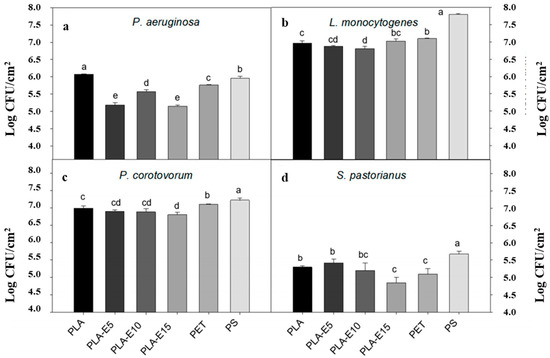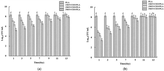 Antibacterial properties of 1MSN/CEO/PLA, 2MSN/CEO/PLA, 3MSN/CEO/PLA, and PLA films: (a) E. coli, (b) S. aureus. Reprinted with permission from Ref. [85], published by Elsevier, 2022. a–d values indicate values which were significantly different (p < 0.05), where a was the lowest value.