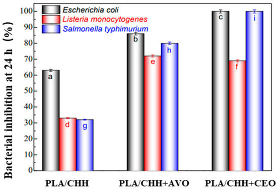 Antibacterial effect of PLA antibacterial films with 0, 5, 10, 20, and 30% of CIs on Escherichia coli and Listeria monocytogenes [66].
