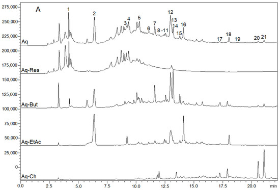 | 8 | 9.7 | 611.1636 | 465.1056, 303.0527, 147.0666 | Quercetin-rhamnosyl-hexoside | [13] |