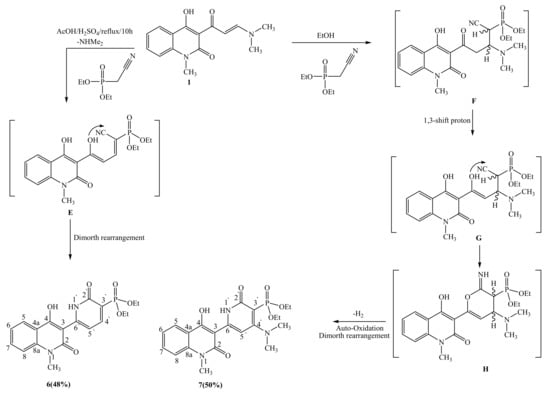 The substituted diethyl [6-(4-hydroxy-1-methyl-2-oxo-1,2-dihydroquinolin-3-yl)-2-oxo-1,2-dihydropyridin-3-yl]phosphonate (6) was obtained in a 48% yield by reacting compound 1 with diethyl cyanomethylphosphonate under the same strong acidic circumstances (Scheme 3). The presence of an acidic medium was responsible for the reduction in the intermediate’s E cyano-group. Strong absorption bands at 2980 (C-Haliphatic), 1720 (C=Oamide), and 1076 (P-O-C) cm−1 were visible in compound 6’s IR spectra. The ethoxy group’s distinctive triplet (δ = 1.13 ppm) and quartet (δ = 3.82 ppm) were present in the 1H-NMR spectra of compound 6. Additionally, it revealed a brand-new singlet for the NH proton at δ 10.2 ppm. The 13C-NMR spectra of 6, which showed the specific carbon atoms at d 15.0 (CH3), 64.0 (CH2), and 164.5 (C=Oamide), were also used to support the structure of 6. Additionally, a chemical shift in its 31P-NMR signal was seen at δ 24.0 ppm. In (Scheme 3), a conceivable method for the production of 6 is put forth.