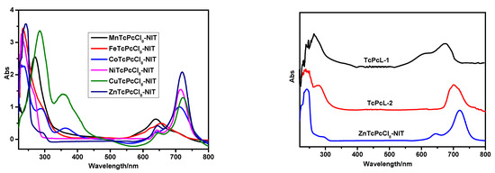 The UV-Vis spectra of the intermediates and MPcTcCl8-NIT catalysts were shown in Figure 5. From the spectrum of TcPcL-2, the peak at 278 nm indicated that the hydroxyl in TcPcL-1 was oxidized to an aldehyde group. In general, phthalocyanines showed two characteristic absorption bands in the UV-Vis spectrum. The Q absorption band between 600 and 750 nm was assigned to the transition of electrons from the highest occupied molecular orbital 6, e.g., (HOMO) to the lowest unoccupied molecular orbital 2a 1u (LUMO). The “B-band” was located at a higher p-level LUMO between 220 and 380 nm. The intensity of the Q-band of the FePcTcCl8-NIT and MnPcTcCl8-NIT catalysts decreased significantly due to the easy aggregation of the two catalysts. In addition, the aggregation effect led to the broadening of the corresponding UV absorption spectrum, and the UV absorption peak of the FePcTcCl8-NIT and MnPcTcCl8-NIT catalysts blue-shifted to 667 nm and 640 nm. The Q absorption band of ZnPcTcCl8-NIT underwent a redshift, first from 678 nm to 700 nm; and finally to 720 nm, due to the introduction of amino and free radical auxochromic groups onto the phthalocyanine. The intensity of the B absorption band of ZnPcTcCl8-NIT was enhanced. All the results indicated that the radicals were successfully immobilized onto phthalocyanine.