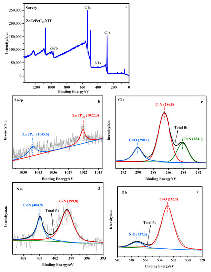 The XPS spectra of ZnPcTcCl8-NIT was shown in Figure 6a, indicating that the main elements contained in the MPcTcCl8-NIT catalysts were C1 s, N1 s, O1 s, and various metal elements. Since the content of the central metal ions was relatively low relative to other elements, the peaks displayed in the total element diagram also showed a low intensity. Figure 6b–e showed the high-resolution XPS spectra for each element in the ZnPcTcCl8-NIT radical. Figure 6b showed that the Zn 2p signals were located at approximately 1022.3 eV and 1045.6 eV, respectively, indicating that the metallophthalocyanine host was not affected by the synthesis of the catalyst. From the C1s spectrum in Figure 6c, there were three signal peaks at 284.1 eV, 286.5 eV, and 290.1 eV, and it could be observed that the carbon element in the ZnPcTcCl8-NIT catalyst has three bond shapes: C=N, C-N and C=O. It could be observed from Figure 6d that the signal peaks for N 1s were located at 399.8 eV and 404.9 eV, indicating that there were C-N and C=N bonds in the bonding state in the synthesized substance. As shown in Figure 6e, the O 1s peak state was the basic oxidation state of the O atom, which was displayed at approximately 532.9 eV and 537.3 eV, respectively, indicating that two forms existed: one was the C=O double bond, and the other was the N-O bond. It could be concluded that the ZnPcTcCl8-NIT catalyst was successfully synthesized in combination with the infrared test.
