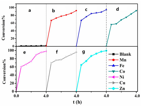 The desulfurization rates of the MPcTcCl8-NIT catalysts with different central metal ions on thiophene model fuel were shown in Figure 7. Compared with the blank experiment (the same desulfurization conditions without catalysts) under natural illumination, the content of sulfur in model fuel was significantly decreased because of the catalytic oxidation reaction of MPcTcCl8-NIT catalysts. The desulfurization rates of MPcTcCl8-NIT catalysts with different metal centers showed some differences. The desulfurization rates of MnPcTcCl8-NIT, FePcTcCl8-NIT, CoPcTcCl8-NIT, NiPcTcCl8-NIT, CuPcTcCl8-NIT, and ZnPcTcCl8-NIT were 92.32%, 94.75%, 92.54%, 98.09%, 95.91%, and 99.61%, respectively. ZnPcTcCl8-NIT showed the highest desulfurization rate, reaching 99.61%. The desulfurization rates of the other MPcTcCl8-NIT catalysts all reached more than 90%, and all MPcTcCl8-NIT catalysts achieved deep desulfurization. These results indicated that the synthesized MPcTcCl8-NIT catalysts had a good desulfurization effect on thiophene.