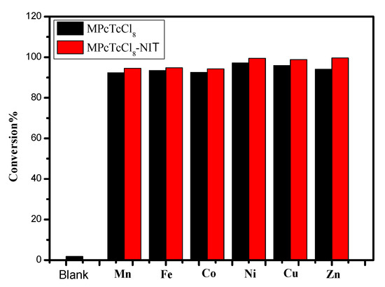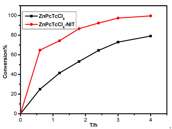 As shown in Figure 8, the desulfurization reaction of pure metallophthalocyanines needed to be performed at 60 °C using a xenon lamp as a simulated light source, while for the MPcTcCl8-NIT catalysts, the desulfurization reactions were carried out under natural light and room temperature. The results showed that the MPcTcCl8-NIT catalysts could lead to a significant improvement of the catalytic degradation for the thiophene compared to the unmodified metallophthalocyanine compounds, the degree of improvement was 1.2%, 1.3%, 1.73%, 2.23%, 2.94%, and 5.53%, respectively. It was demonstrated that MPcTcCl8-NIT catalysts could achieve more effective desulfurization rate under milder conditions than that of the metallophthalocyanines. In order to further confirm the conclusion, the ZnPcTcCl8-NIT catalyst and pure ZnPcTcCl8 were applied to desulfurization experiments under the same conditions. The desulfurization rate of ZnPcTcCl8-NIT and pure ZnPcTcCl8 for thiophene reached 99.61% and 79.08% under the room temperature and natural light (Figure 9). Meanwhile, this result also further indicated that the influence of the NIT groups on the catalytic activity of metallophthalocyanines was obvious. The desulfurization rate of the ZnPcTcCl8-NIT catalyst could be increased by 20.53% due to the chemical bonding of the NIT radicals to ZnPcTcCl8 (Figure 9). The combination of NIT nitroxide radicals on metallophthalocyanine compounds could significantly improve the desulfurization activity for the catalyst materials.