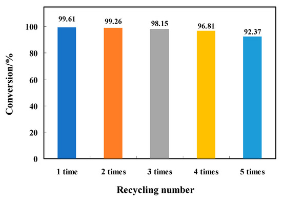 In practical applications, the stability of these catalysts in cyclic use is an important indicator for characterizing the catalyst performance. To evaluate the cyclic stability of ZnPcTcCl8-NIT, a cyclic test reaction was designed. Under the optimal reaction conditions, the reusability of the catalysts with the best effect was determined. After each cyclic test of ZnPcTcCl8-NIT for desulfurization was complete,, ether was added to the reaction system, ZnPcTcCl8-NIT was precipitated, filtered, and dried under vacuum, and then the catalyst was recovered for recycling. The above operation was repeated for each loop, and the test conditions remained the same each time. The results of the recycling test of the ZnPcTcCl8-NIT catalyst of desulfurization for thiophene showed that under the optimal reaction conditions, the desulfurization rate of ZnPcTcCl8-NIT still could reach 92.37% after five times recycling, which indicated that the MPcTcCl8-NIT catalysts had a good recycling stability and could be reused (Figure 10).