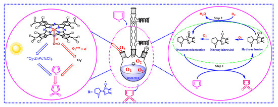 By summarizing the experimental results obtained for the photocatalytic performance of MPcTcCl8-NIT catalysts for the degradation of thiophene in n-octane, a mechanism for the oxidative catalytic desulfurization was proposed (Figure 11): metallophthalocyanine and NIT nitrogen oxygen radicals could achieve the simultaneous degradation of thiophene based on the two parts of the host. First, the thiophene molecules to be degraded were dissolved in DMF solution, so that the MPcTcCl8-NIT catalysts could be completely contacted with thiophene. MPcTcCl8-NIT was then added to the system. On one hand, the active radical components were used to catalyze the oxidation and degradation of thiophene and converted it into sulfate ions and sulfones. The oxygen in the air continued to promote the conversion of NIT nitroxide radicals from hydroxylamine to the original free radicals [34,35,36]. Meanwhile, in the presence of visible light, the main part of metallophthalocyanine absorbed photoelectrons to change its own energy and generated photoelectrons combined with oxygen [37,38,39,40]. Under the action of electron–hole pairs, O2-MPcTcCl8-NIT catalysts were immediately converted into the activated state of *O2-MPcTcCl8-NIT catalysts, and *O2-MPcTcCl8-NIT catalysts converted thiophene to sulfate ions and sulfones by oxidation. The synergistic catalytic oxidation of metallophthalocyanines and free radicals achieved the effect of deep desulfurization.