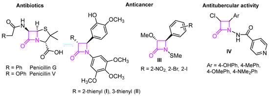 β-Lactam derivatives are the most commonly used bactericidal agents worldwide [1]. Moreover, the β-lactam ring is also found in many other natural and unnatural compounds, with a wide spectrum of activities [2] (Figure 1). For example, in 2011, Meegan et al. reported the synthesis of a series of β-lactams via the Staudinger reaction [3]. Among these, 3-(2-thienyl) I and 3-(3-thienyl) II displayed the highest potency in human MCF-7 breast cancer cells, with IC50 values of 7 nM and 10 nM, respectively, comparable to combretastatin A. Dou et al. have also demonstrated that N-thiolated β-lactams III have a tumor cell-killing ability through the induction of DNA damage and subsequent apoptosis [4]. Additionally, Hussain et al. reported the synthesis of β-lactam derivatives IV with significant antimycobacterial (antitubercular) activity [5]. β-Lactams have been prepared using a wide range of strategies [6,7]. Among these are the Staudinger procedure, also called the Staudinger ketene–imine non-photochemical 2 + 2 cycloaddition [8,9]; the carbonylative ring-opening of aziridines [10]; the Kinugasa reaction, which takes place between terminal alkynes and a nitrone in the presence of copper(I) [11,12,13,14]; and metal-catalyzed C-H insertion of diazoamide carbenes activated by rhodium and ruthenium complexes, among others [15].