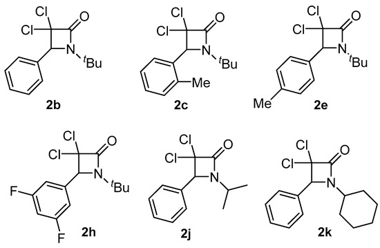 As was mentioned before with the background reported in the Introduction section, it was of great interest to investigate and characterize some of the β-lactams prepared in our previous investigation, namely 2b, 2c, 2e, 2h, 2j and 2k, for their hemocompatibility and cytotoxic activity (Figure 2).