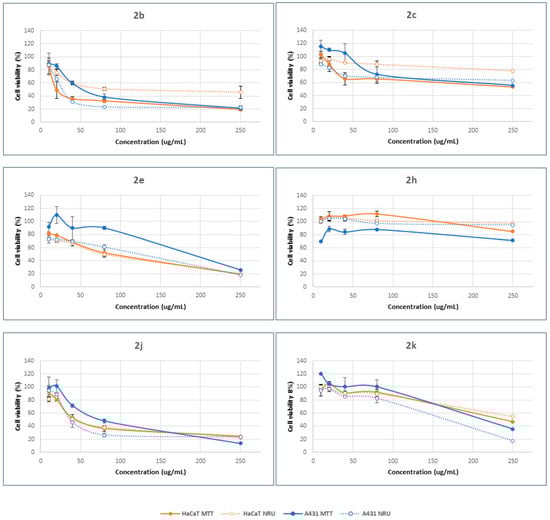 Two different endpoints, 3-(4,5-dimethyl-2-thiazolyl)-2,5-diphenyltetrazolium bromide (MTT) and neutral red uptake (NRU), were used to assess differences in cell-induced cytotoxicity. The former method offers details about the modification of the metabolic activity of mitochondria inside the cells. In the latter case, however, the information derived is related to the interaction with the plasmatic membrane. Dose–response curves were determined by the MTT [23] and NRU [24] assays using HaCaT and A431 cell lines. Cytotoxicity assays were performed at concentrations ranging between 10 and 250 µg/mL. The results demonstrated that the cytotoxic response is highly dependent on the structural characteristics of β-lactam compounds and their concentration. In general, cell viability decreases with increasing concentration, showing a dose–concentration response (Figure 3). However, the final response seems to be a function of the β-lactam derivative.