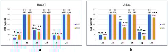 Half-maximal inhibitory concentration (IC50) values of the corresponding β-lactams on HaCaT (a) and A431 (b) cell lines as a function of the endpoint method. The data correspond to the average of three independent experiments ± standard deviation. * p < 0.005 and ** p < 0.001 indicate significant differences in comparison with compound 2b. ● p < 0.005 and ●● p < 0.001 indicate significant differences between endpoint methods for the same compound.