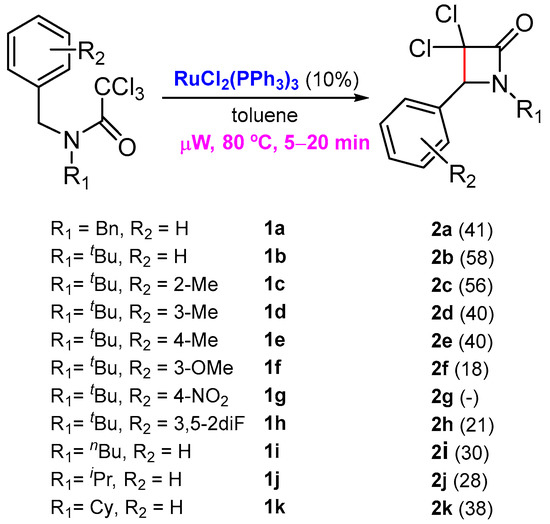 As part of our efforts to prepare new nitrogen-containing heterocycles with cytotoxic activity, a few years ago, we reported an unprecedented ruthenium-catalyzed synthesis of β-lactams from readily available N-benzyltrichloroacetamides through benzylic C-H activation [16]. This work was an extension of a previous investigation where we reported the first Grubbs’ second-generation catalyst-promoted intramolecular dearomative ATRC, with trichloroacetamides embodying an electron-rich arene for the preparation of 2-azaspirodecadienes [17,18]. At that time, there was only one example reported by Cramer and co-workers, where a similar saturated C(sp3)-C(sp3) bond formation was achieved through an asymmetric C-H functionalization from chloroacetamides, catalyzed by palladium(0) [19]. In our investigation, the best results were attained in the presence of a catalytic amount of RuCl2(PPh3)3 under microwave activation, in a very short reaction time (Scheme 1) [16].