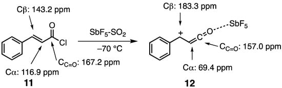 Klumpp et al. reported the reactivity of cinnamic acid (8) in very strong acids (Scheme 4) [13]. They found that if the aromatic moiety of cinnamic acid (8) has an electron density higher than that of halobenzene, the aromatic acylation reaction does not proceed to give the aromatic ketone (10), but benzene reacts at the β-position of the olefin and the resultant saturated carboxylic acid undergoes an intramolecular aromatic acylation reaction to give the cyclized product (9). This is because the acylium ion is conjugated to the styrene moiety, so that the cationic carbon is switched from the carbonyl carbon (CC=O) to the benzyl (β-)carbon (C), as in 12 (Scheme 5) [14]. Therefore, the desired aromatic ketone formation does not proceed because the aromatic ring reacts with the benzyl carbon atom first.