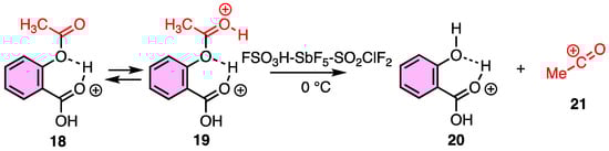 Salicylic acid has long been known as a good leaving group [23]. Olah et al. focused on the intramolecular hydrogen bond formation of salicylic acid and examined protonation of the phenolic oxygen atom (as in 18, Scheme 7). They found that acetylsalicylic acid was diprotonated to give the dication 19 at −40 °C (Scheme 7) [24]. However on warming to 0 °C, the dication 19 was transformed to monocation 20 and acyl cation 21 (Scheme 7). This suggests that salicylic acid can form an intramolecular hydrogen bond and serve as a good leaving group to form the acylium ion 21. This aromatic acylation reaction has the potential to be a versatile synthetic method.