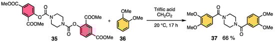 Thus, we next synthesized carbamate (35) (Scheme 10), whose cleavage ability was improved by introducing electron-withdrawing o, p-bis(methyl salicylate). We found that the reaction with an aromatic compound (36) in a strong acid gave diamide 37 in 66% yield (Scheme 10) [26]. These experimental results suggest that it is possible to control the reactivity of carbamates by regulating their cleavage capacity.