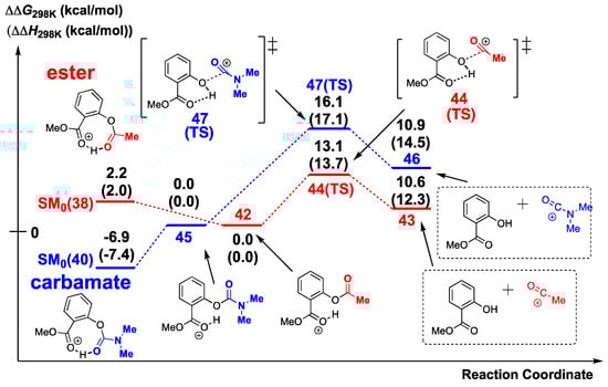 The formation of acylium ion (43) from the protonated ester (42) requires cleavage of the C–O bond between the carbonyl carbon and the phenolic hydroxyl group of methyl salicylate through the TS (44). In this case, the intramolecular hydrogen bond of methyl salicylate reduces the activation energy required for C–O bond cleavage, resulting in rapid acylium ion formation (∆G‡298K = 13.1 [kcal/mol], ∆H‡ = 13.7 [kcal/mol]). On the other hand, the carbamate (45) forms Y-type conjugation [27] around the carbonyl carbon atom, which increases the activation energy of C–O bond cleavage between the carbonyl carbon and the phenolic hydroxyl group of methyl salicylate through the TS (47) (∆G‡298K = 16.1 [kcal/mol], ∆H‡ = 17.1 [kcal/mol]). Therefore, isocyanate cation (46) formation from the carbamate (40) is slower than acylium ion formation from the ester [33].