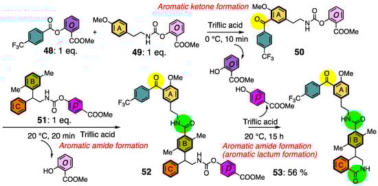 When the ester (48) and carbamate (49), containing o-methyl salicylate as a leaving group react in a strong acid at 0 °C, o-methyl salicylate is selectively removed from the ester group and reacts with the aromatic ring present in the carbamate (49) in an intermolecular reaction to give the aromatic ketone (50) (Scheme 13). Subsequently, another carbamate (51) bearing an aromatic ring is added to the reaction solution, and when the temperature is raised to room temperature (20 °C), o-methyl salicylate is cleaved from the carbamate (50) and reacts intermolecularly with the aromatic part B of the carbamate (51) to give an aromatic amide (52) (Scheme 13). After a sufficient reaction time (15 hr), isocyanate cation is also formed from the carbamate (52) incorporating p-methyl salicylate to give an aromatic amide via intramolecular cyclization (53) (Scheme 13). These three electrophilic reactions can be conducted sequentially in one pot by adjusting the leaving group, reaction temperature and reaction time [33].