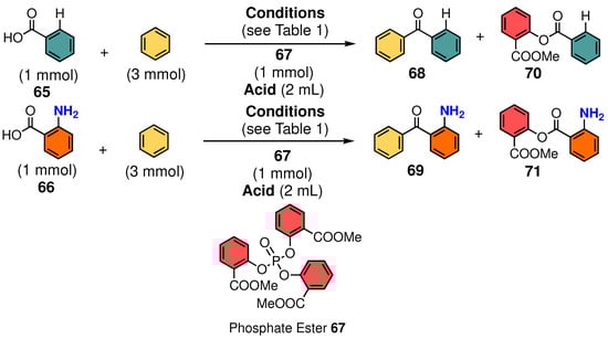 The reaction of benzoic acid (65) with benzene in trifluoromethanesulfonic acid (TfOH) in the presence of phosphoric acid triester (67), a triester of o-methyl salicylate, at room temperature for 20 min gave the desired aromatic ketone (68) in a yield of 92% (Scheme 16, Table 1, Entry 1) [80]. In a control experiment in the absence of 67, the desired aromatic ketone (68) was not obtained after reaction for 20 min. When the reaction time was extended to 24 h, the aromatic ketone (68) was produced even in the absence of 67, but in only 48% yield (Table 1, Entries 2 and 3). Thus, it was suggested that phosphoric acid triester (67) promotes the reaction of benzoic acid (65) with benzene, and can be regarded as an organocatalyst. When a much weaker acid, trifluoroacetic acid (TFA) was used, the desired aromatic ketone (68) was not formed, but ester 70 was produced (Table 1, Entry 4). Thus, the aromatic acylation reaction requires a strong acid.