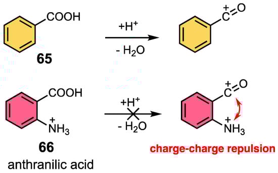 These reactions are noteworthy, because the acylium cation is difficult to form from anthranilic acid, as shown in Scheme 16. The aromatic amine is basic enough to be pronated in the acid media, and the subsequent ionization of the carboxylic acid functionality to the acylium cation is blocked due to charge-charge repulsion (Scheme 17) [16,17,18,19,20]. Thus, the promoting effect of phosphoric acid triester 67 plays a key role.