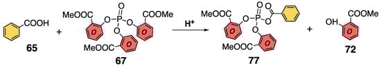 The yield of aromatic ketone (68) was greatly increased when the phosphoric acid ester contained two (74) or three (67) methyl salicylate linkers rather than a single methyl salicylate (75). In other words, the ortho ester group of methyl salicylate, which is a potent leaving group, functions to promote P–O bond formation with an external carboxylic acid, 65, leading to ester exchange (Scheme 19).