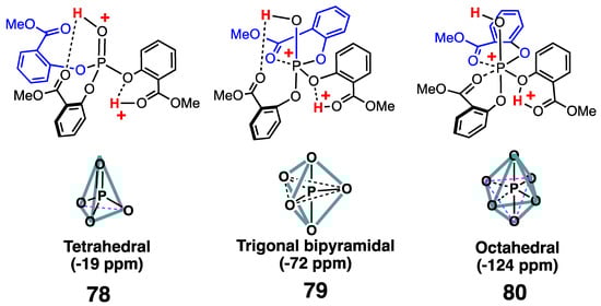 The 1H NMR spectrum of 67 in trifluoromethanesulfonic acid showed a peak at low field (about 15 ppm), that was assigned to a proton forming an intramolecular hydrogen bond between the phenolic oxygen atom of one methyl salicylate and the carbonyl oxygen atom of the ortho ester group [25]. On the other hand, the NMR signal of the proton bound to the phosphate non-bridged oxygen atom is difficult to observe due to fast proton exchange with the solvent (CF3SO3–H) [25].