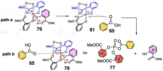 The 31P NMR chemical shifts were calculated for the diprotonated form, which is protonated at the non-bridged oxygen atom and in one methyl salicylate, of each of the structures shown in Scheme 20. The calculated 31P chemical shift of the trigonal bipyramidal structure (79) was closest to the experimental value (31P NMR = −78 ppm). Therefore, there are two possible reaction pathways leading to P–O bonding of carboxylic acid 65 (Scheme 21): path a involves dissociation of methyl salicylate first from dication 79, followed by addition of the carboxylic acid (65), while path b involves addition of the carboxylic acid (65) to dication 79, followed by dissociation of methyl salicylate. Experimentally, the presence and intermediacy of 77 were confirmed (see the following section), but distinguishing the two pathways is not easy. The DFT calculations suggest that path b is marginally more favorable than path a.