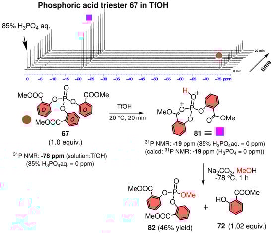 In the 31P NMR spectrum, the peak of 67 was observed at about −19 ppm in CDCl3 and in TFA, whereas in TfOH the signal shifted significantly toward high field at about −78 ppm. Olah et al. [81] reported that a significant change in 31P NMR peak values is usually not observed upon protonation of phosphoric acid esters at unbridged oxygen atoms. In addition, the 31P NMR peak values of the positional isomers 74 (−19 ppm) and 75 (−19 ppm) in CDCl3 are similar to those in TfOH (74: −21 ppm, 75: −24 ppm). Thus, we consider that the significant shift in the 31P NMR peak values of 67 in TfOH is attributable to a structural change (Scheme 20).