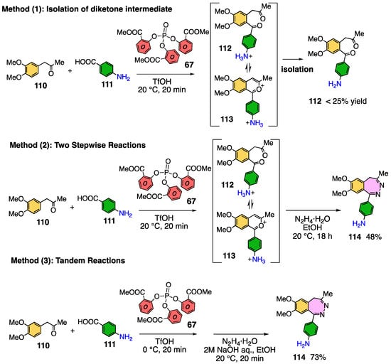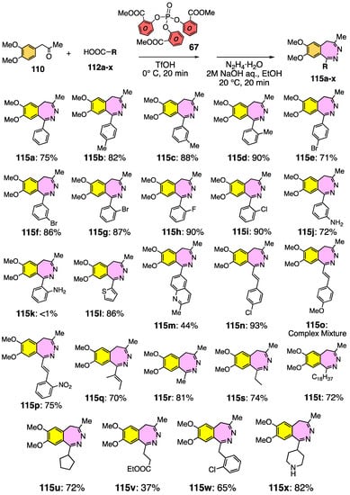 - Sumita, A.; Lee, J.; Otani, Y.; Ohwada, T. Facile Synthesis of 2,3-Benzodiazepines Using One-pot Two-step Phosphate-Assisted Acylation-Hydrazine Cyclization Reactions. Org. Bio Chem. 2018, 16, 4013–4020. [Google Scholar] [CrossRef] [PubMed]