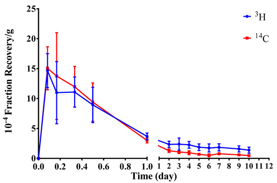 The average radioactivity recovery concentrations of 3H and 14C in blood samples were collected at each time point (mean ± SD, n = 6).