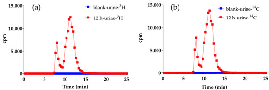 3H (a) and 14C (b) radio-chromatograms of blank and 12 h urine.