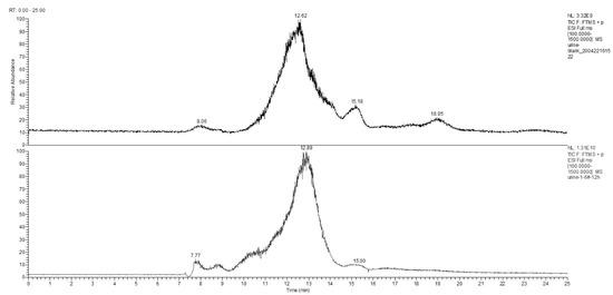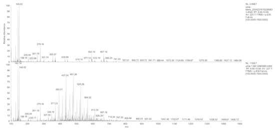 Different hydrogel-derived metabolites were evaluated by combining the results of the radioactivity chromatographic peaks with the respective mass spectrometry (MS) retention time. The first-stage MS (Figure 5) at m/z 100–m/z 1500 within RT 8.0–10.0 min was extracted from the total ion flux (Figure 6) for the control and the experimental urine samples at 12 h. Compared to that 12 h urine, the first-stage mass spectrometry of the control group urine showed a typical polymer mass spectrum in the range of m/z 400 to m/z 600 (a series of mass spectra peaks with equal differences in m/z ).