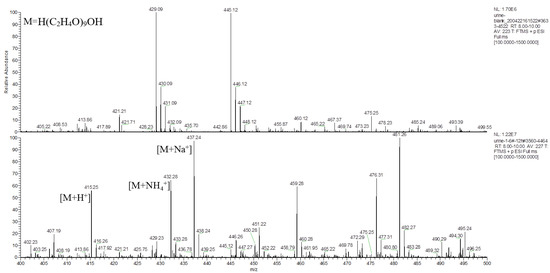 The main component of the hydrogel was the tetra-PEG-SS, having a molecular formula of H(C2H4O)nOH, according to the MS analysis. Taking PEG-9 (H(C2H4O)9OH) as an example, analysis of the typical first-stage MS peaks of the control and the experimental group urine samples at 12 h (Figure 7) inferred that m/z 415.25, m/z 432.28, and m/z 437.24 might be the hydrogenation peak, ammonia addition peak, and sodium addition peak of H(C2H4O)9OH, respectively. The chromatograms of the control and the experiment group urine samples at m/z 415.25 were simultaneously extracted (Figure 8), which showed significantly higher peaks for the experimental samples compared to that of control samples, indicating that m/z 415.25 was derived from metabolites produced after the labeled hydrogel was implanted, and the products were PEGs with different degrees of polymerizations.