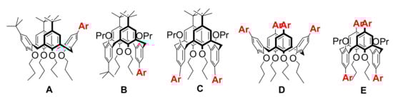 - Verboom, W.; Vreekamp, R.H.; Rudkevich, D.M.; Reinhoudt, D.N. Functionalization and Application of Calixarenes. In Molecular Engineering for Advanced Materials; Becher, J., Schaumburg, K., Eds.; Springer: Dordrecht, The Netherlands, 1995; pp. 119–145. [Google Scholar]
