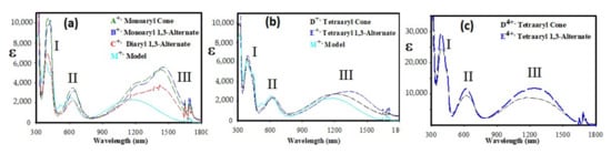 | Calixarene (Calix) | I, λmax (ε) | II, λmax (ε) | III, λmax (ε) | Calixarene (Calix) | I, λmax (ε) | II, λmax (ε) | III, λmax (ε) | ||