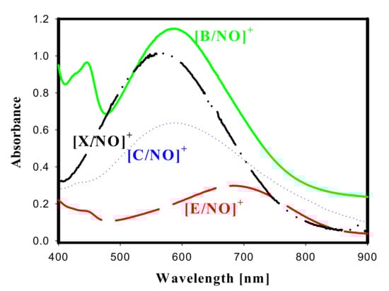 - Rathore, R.; Abdelwahed, S.H.; Guzei, I.A. Synthesis of a Calix[4]arene Derivative for Isolation of a Stable Cation Radical Salt for Use as a Colorimetric Sensor of Nitric Oxide. J. Am. Chem. Soc. 2004, 126, 13582–13583. [Google Scholar] [CrossRef] [PubMed]