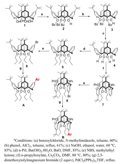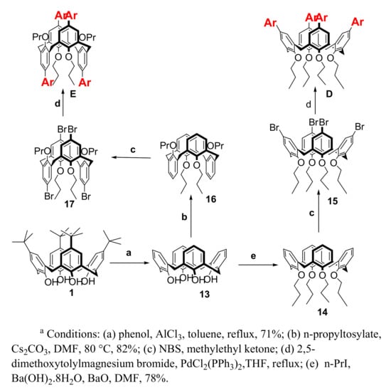 - Xie, D.; Gutsche, C.D. Calixarene Anhydrides as Useful Synthetic Intermediates1. J. Org. Chem. 1997, 62, 2280–2284. [Google Scholar] [PubMed]