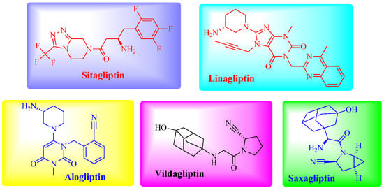 The glucagon-like peptide-1 (GLP-1) has recently emerged as a possible target for T2DM treatment. GLP-1 is produced by the gut after a meal, enhancing insulin output. It has been demonstrated that increased levels of GLP-1 may contribute to a better glycemic control in T2DM individuals. DPP-IV controls the activity of GLP-1 by cleaving the N-terminus of GLP-1 [7,8,9,10,11,12,13,14,15,16,17,18,19,20,21,22,23,24,25,26,27,28,29,30,31,32,33,34,35,36]-amide to generate inert GLP-1 [9,10,11,12,13,14,15,16,17,18,19,20,21,22,23,24,25,26,27,28,29,30,31,32,33,34,35,36]-amide. The quantity of GLP-1 in the circulation may be increased by inhibiting DPP-IV [15]. As a result, a significant amount of time and effort has been dedicated to the research of DPP-IV inhibitors as potential treatments of T2DM. Sitagliptin [16] is one of these drugs, and it has been available in the United States since 2006 as the first FDA-approved DPP-IV inhibitor. Saxagliptin [17,18], vildagliptin [19], alogliptin [20], and linagliptin [21] (Figure 1) are all medications that have either been studied in diabetic patients or approved for sale in some countries. Based on structural similarities or differences with the DPP-IV molecule, DPP-IV inhibitors may be classified as either peptidomimetics (vildagliptin and saxagliptin) or non-peptidomimetics (sitagliptin, alogliptin, linagliptin). They are reversible competitive inhibitors of the DPP-IV substrates. These compounds have various degrees of affinity with DPP-IV substrates. The selectivity of the peptidomimetics toward DPP-IV is often lower as compared to DPP8/9. The greater the relative inhibition of DPP8/9 and the lower the relative selectivity toward DPP-IV, the greater the risk of adverse consequences (allergic skin manifestations, etc.) [22,23]. When compared to non-peptidomimetics, peptidomimetics display a distinct DPP-IV inhibition mechanism. Because non-peptidomimetics generate non-covalent extra-cellular interactions with residues in the catalytic region of the DPP-IV substrate, their inhibiting activity is powerful and rapid. In contrast, inhibition of the DPP-IV substrate by peptidomimetics takes place in a mode that includes the development of a reversible covalent enzyme-inhibitor complex. This complex may be broken down again. This complex binds to and dissociates from the catalytic site of the DPP-IV substrate in a very slow manner, resulting in the persistent inhibition of the DPP-IV enzyme a long time after the medication has been rendered ineffective. Because of this, the catalytic activity is hindered long after the free drug has been eliminated from circulation. In fact, vildagliptin and saxagliptin may be able to suppress DPP-IV activity for a longer period while having relatively short half-lives [24,25].
