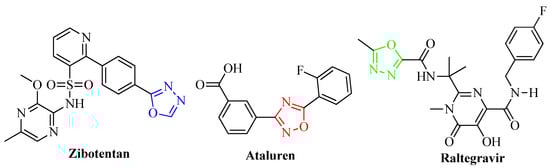 Owing to their unique properties, oxadiazoles have attracted the attention of scientists in the disciplines of polymer and material science. These compounds feature five-membered rings comprised of two carbons, two nitrogens, and one oxygen atom (Figure 9). The number of patent applications for oxadiazoles has climbed to a total of 646 over the last nine years. This suggests that the scientific community has attached great importance to this class of chemicals [36]. Zibotentan, a potential anticancer agent, and ataluren (Figure 10), a potential therapeutic for cystic fibrosis, are two examples of oxadiazole-containing compounds that are now participating in late-stage clinical studies [37]. The only compound available on the market that currently contains oxadiazole is an antiviral drug called raltegravir (Figure 10), which is used to treat HIV infection [38]. Oxadiazoles are now being included in an increasing number of therapeutic approaches in a wide range of disease areas, including but not limited to diabetes [39], obesity [40], inflammation [41], cancer [42], and infection [43].