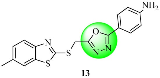 Kumar et al. [61] discovered that some 2-((benzothiazol-2-ylthio) methyl)-5-phenyl-1,3,4-oxadiazole derivatives have the potential to act as anti-diabetic compounds. Using glibenclamide as the reference, each of the synthetic compounds were evaluated for their capacity to combat diabetes in an animal model. At a dose of 350 mg/kg p.o., compound 13 (Figure 11) displayed the most noticeable effect of all molecules, even though all showed a significant activity (orally).