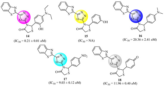 Benzothiazole-1,3,4-oxadiazole-4-thiazolidinone hybrid derivatives were synthesized by Bhutani et al. [62]. OGTT in non-diabetic rats and streptozotocin-induced diabetic rat models were used to evaluate seven compounds with the highest docking scores. The blood glucose levels were significantly reduced with all of the studied compounds, ranging from good to moderate. The anti-diabetic effects of the three compounds (14, 15 and 16, Figure 12) were superior to those of the conventional medicine pioglitazone, showing a glucose concentration of 178.32 ± 1.88 mg/dL, compared to the lower concentrations of glucose of 157.15 ± 1.79 mg/dL, 154.39 ± 1.71 mg/dL, and 167.36 ± 2.45 mg/dL reported for 14–16. Acarbose (IC50 = 18.5 ± 0.20 µM) was found to be the most potent inhibitor of alpha-glucosidase among the seven derivatives examined. However, three of its derivatives, compounds 14, 17, and 18 (Figure 12), displayed lower IC50 values (0.21 ± 0.01 µM, 9.03 ± 0.12 µM and 11.96 ± 0.40 µM, respectively), suggesting that they were less effective than the ordinary acarbose. In other words, these innovative hybrids could be used as a basis for the development of novel agents [62].