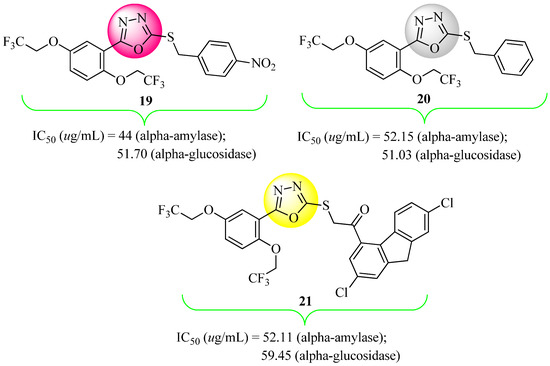 New 5-(2,2,2-trifluoroethoxy)phenyl-1,3,4-oxadiazol-2-thiol derivatives have been synthesized and analyzed for their biological activities in vitro and in vivo. In comparison to acarbose (IC50 = 34.71 μg/mL), these compounds showed α-amylase inhibitory activities in the IC50 range of 40.00–80.00 μg/mL. Compounds 19 and 20 were the ones that exhibited the highest levels of activity in vitro compared to the other synthesized compounds. Animal experiments showed that compounds 19, 20, and 21 (Figure 13) were able to reduce glucose levels in Drosophila, but displayed a 17–30% lower capacity than acarbose. It was shown that compounds 19 and 20 exhibited the highest activity among the produced compounds. In this study, compounds 19, 20, and 21 were revealed to be good candidates for further research as possible anti-diabetes drugs [63].